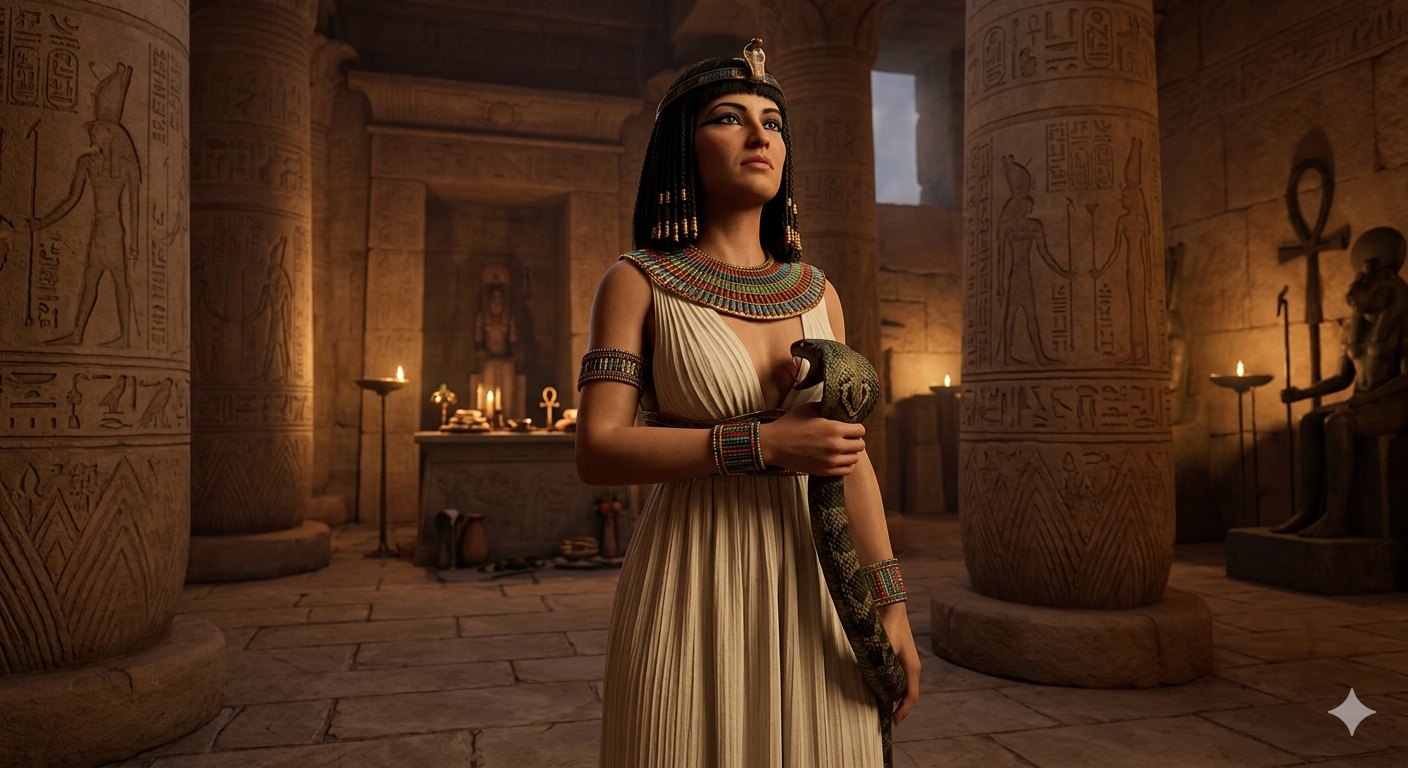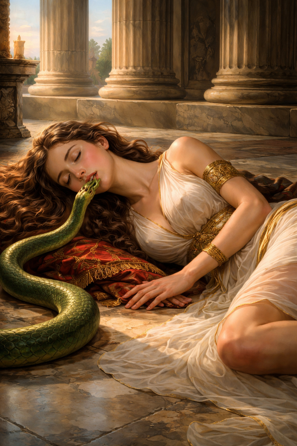 Pour les Égyptiens, le serpent est lié à la protection solaire et à la régénération éternelle. Dans le Livre de l’Amduat, le serpent Mehen entoure la barque solaire. Dans les textes funéraires, le défunt doit parfois absorber l’énergie du serpent pour renaître. La couleur verte (Ouadj) est celle de la résurrection d’Osiris. Un serpent vert entrant par la bouche est l’image exacte du « souffle de vie » (le Ka) réintégrant le corps. La position allongée de la rêveuse évoque la momie en attente de l’« ouverture de la bouche » (rite de l’Ouert-Hékau).